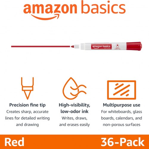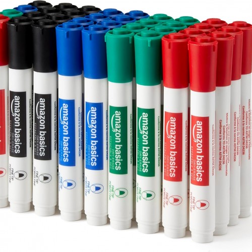Amazon Basics Low-Odor Dry Erase Whiteboard Markers, Fine Tip, 4 Assorted Colors, 36 Count