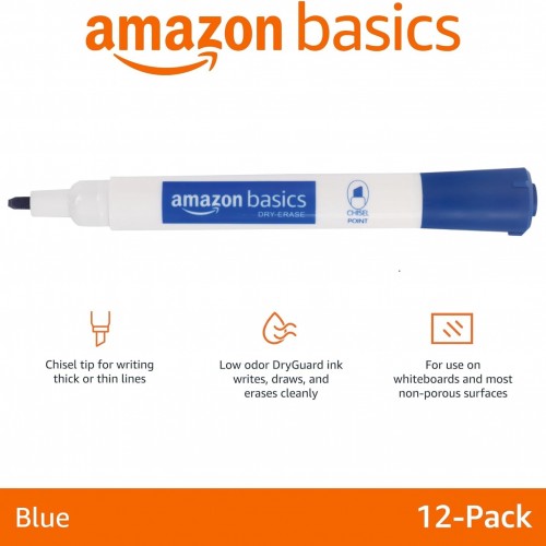 Amazon Basics Dry Erase Markers For Whiteboards, Chisel Tip, Low-Odor, Blue, Pack of 12