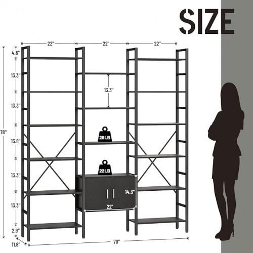 70 x70 Triple 5 Tier Book Shelf, Industrial Large Bookcase with Storage Cabinet, Tall Bookshelf with 14 Open Display Shelves Metal Frame Furniture for Living Room Bedroom Home Office Black