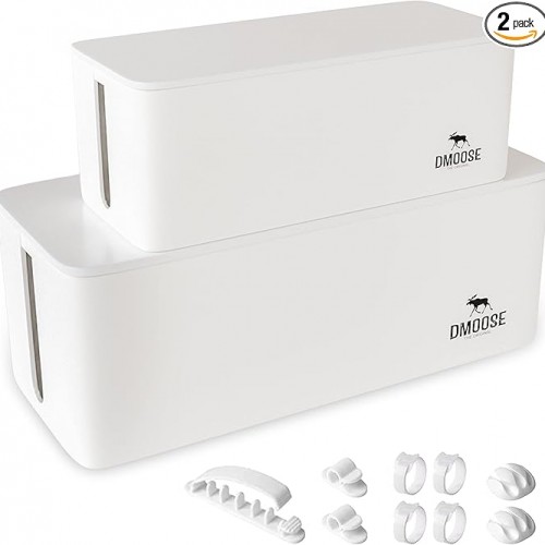 DMoose Cable Management Box – 2 Pack Medium & Large Cord Organizer for Desk & Floor – Cable Organizer Box for Child & Pet – Cable Box Hider for Tidy Office & Home, Power Strip Cover (White, Pack of 2)