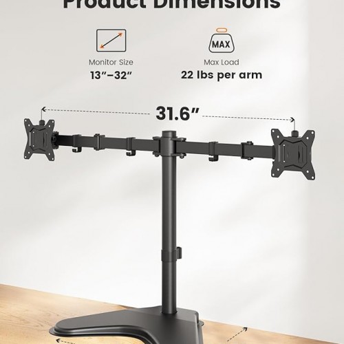 ErGear Freestanding Dual Monitor Stand for 2 Screens up to 32 inch, Heavy Duty Monitor Mount Holds Max 22 lbs per Arm, Height Adjustable Computer Monitor Stand for Desk, VESA 75×75/ 100x100mm, Black