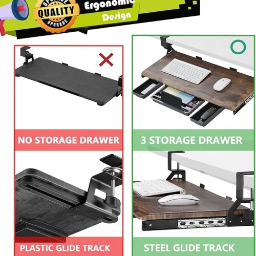 ETHU Keyboard Tray Under Desk, Pull Out Keyboard & Mouse Tray with C-clamp, Ergonomic Desk Keyboard Tray Slide Out, Pull Out Platform Drawer for Home and Office(Wood)
