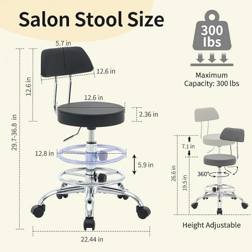 Rolling Stool with Back,Adjustable Height Foot Rest Rolling Salon Chair 19.5’’-26.6’’,Black Ergonomic Stool (Black)