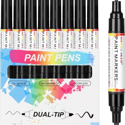 Black Paint Pen Paint Marker – 8 Pack Dual Tip Oil Based Permanent Markers, Extra Fine Tip & Medium Fine Tip (0.7mm & 3mm), Quick Drying, Waterproof, Marker Pen for Fabric (8 Black)