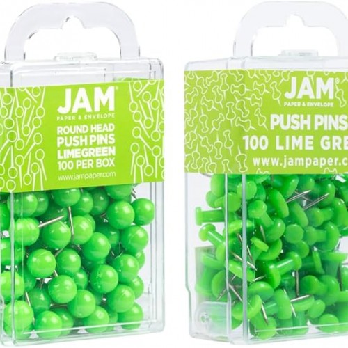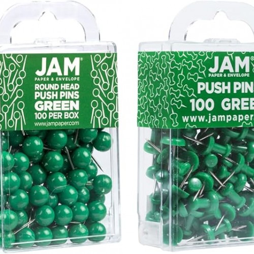 JAM PAPER Colorful Push Pins – Flat & Round Head Thumb Tack Combo Set – Green Pushpins – 200/Pack
