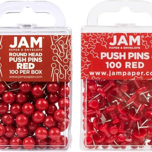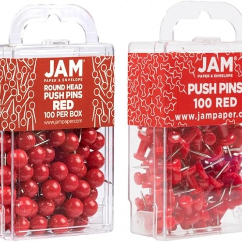 JAM PAPER Colorful Push Pins – Flat & Round Head Thumb Tack Combo Set – Red Pushpins – 200/Pack