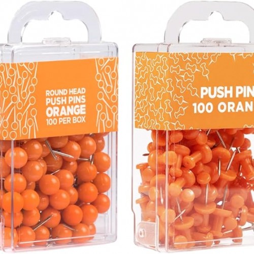 JAM PAPER Colorful Push Pins – Flat & Round Head Thumb Tack Combo Set – Orange Pushpins – 200/Pack