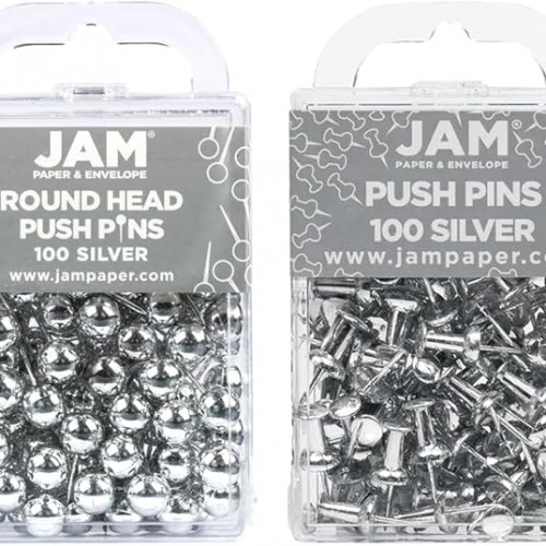 JAM PAPER Colorful Push Pins – Flat & Round Head Thumb Tack Combo Set – Silver Pushpins – 200/Pack