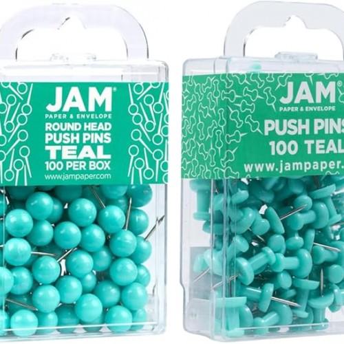 JAM PAPER Colorful Push Pins – Flat & Round Head Thumb Tack Combo Set – Teal Pushpins – 200/Pack