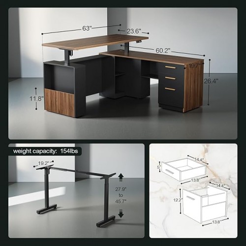 63″ Standing Desk with File Cabinet, Privacy Panel, AC/USB, 1.18″ Desktop, Executive L Shaped Height Adjustable Electric Stand Up Desk, Home Office Table with 3 Drawers, Black Walnut