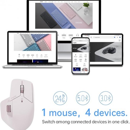 Rapoo MT760 Multi-Device Wireless Mouse, Bluetooth 5.0 and 2.4GHz Multi-Mode Connection, Up to 4 Devices, 11 Programmable Buttons, 4K DPI, Ergonomic Design, 90 Days Battery Life, PC, Pink
