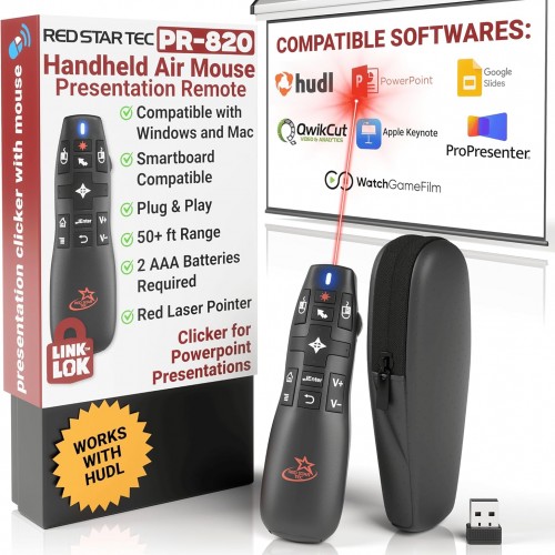 PR-820 Wireless Presentation Clicker with Laser Pointer, PowerPoint Clicker with Air Mouse, Remote for Slideshows, Google Slides, Keynote & Smartboards, Mac/PC Compatible