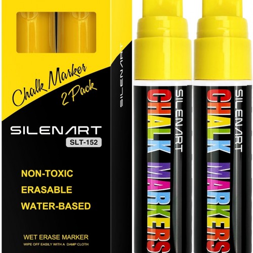 SILENART Yellow Chalk Markers 2 Pack – 15mm Super Wide Tip – White Dry Erase Markers Pen