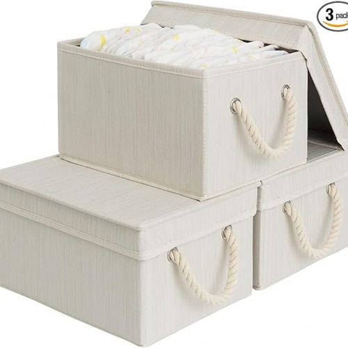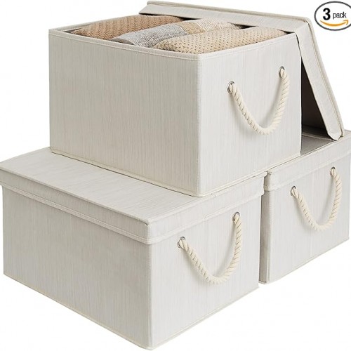 StorageWorks Storage Bins with Lids, Decorative Storage Boxes with Lid and Soft Rope Handles, Foldable Storage Baskets for Closet, Shelves, Stackable, Mixing of Beige, White & Ivory, Jumbo, 3-Pack