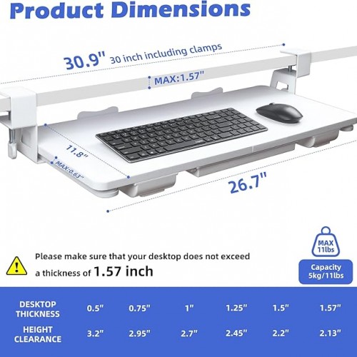Keyboard Tray Under Desk with Drawer,26.77″ X 11.81″Large Size Keyboard Tray with C Clamp-on Mount, Easy to Install, for Home Office (White)