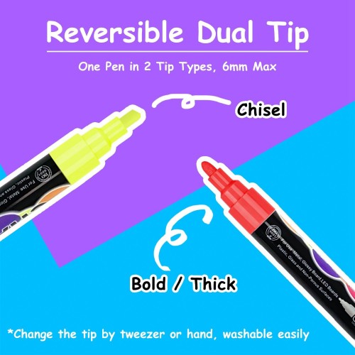 Liquid Chalk Markers Set (8 Pack), 6mm Reversible Thick & Chisel Tip, Wet Erase Paint Pens for Non Porous Blackboard Chalkboard, Car Glass Windows, School Business Supplies (8 Neon Color)