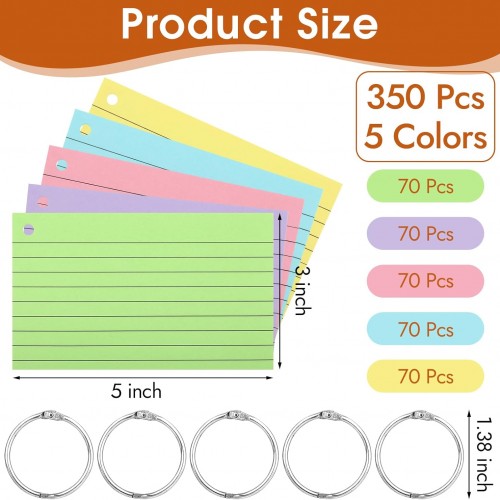 350 Pcs Index Cards With Ring, 3×5 Inches Flash Cards With Rings,Colored Heavy Notecards With Ring, Punched Lined Study Cards For School, College, Home, Office, Memory, To Do List (5 Colors)