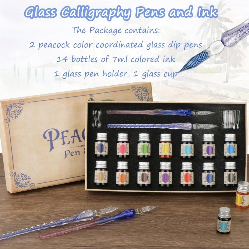 Calligraphy Pens, Dip Pen Set with 14 Color Inks, Glass Writing Instrument for Beginners