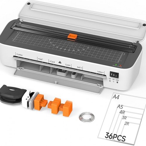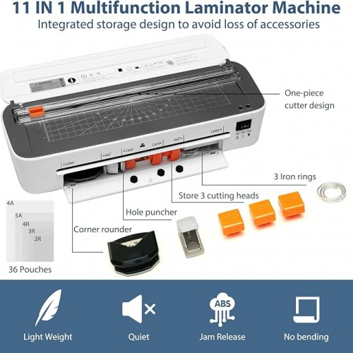 - 🧰【10-in-1 Laminator Kit with Built-In Paper Trimmer & Cutter】 Features an integrated paper trimmer on the machine, along with 3 interchangeable Cutter—for straight cuts, dashed (perforated) lines, and wavy edges. Also includes 3 iron rings, a corner rounder, a hole puncher, and 20 laminating pouches. All accessories are stored neatly inside the built-in compartment
