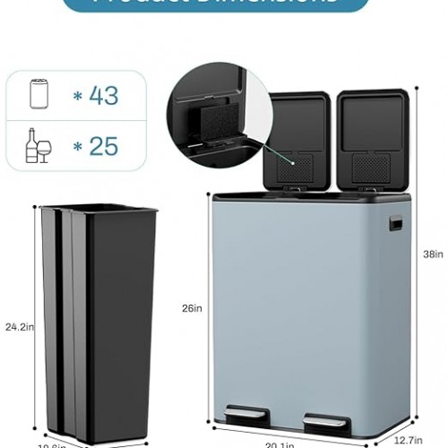 - 2 Removable Inner Buckets: Dual compartment trash can offers separate bins for different types of waste. Each compartment has its lid, which allows you to sort waste efficiently. With a generous capacity of 2 x 8 gallons, combo garbage bin meets your daily needs