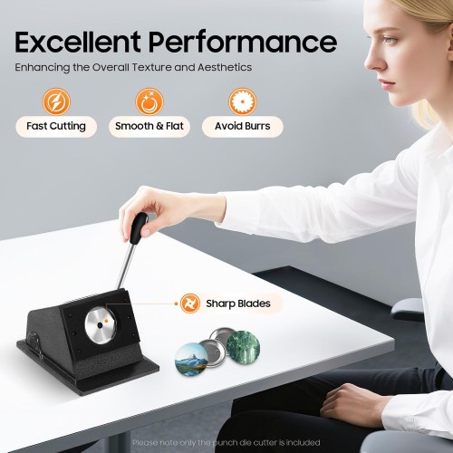 - Precision Cutting Performance with Pin Button Cutter – Cuts perfect 2.28″ (58mm) diameter circles for badges, medals, and crafts. Handles paper (up to 0.66 lbs), thin leather, and cardboard (≤0.076mm thickness) with smooth edges.