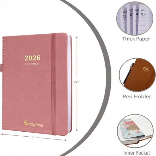 2026 Daily Planner/Calendar, One Page Per Day, Daily Monthly Agenda Planner with Time Slots and Monthly Tabs, Jan – Dec 2026, 5.7″ x 8.25″ Appointment Book, Pen Holder, Leather Cover (2026-Pink)