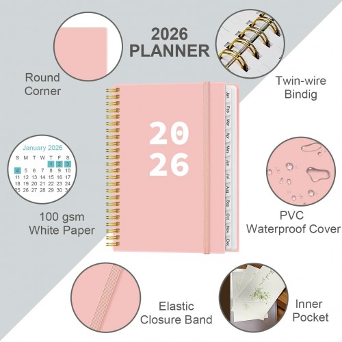 2026 Planner – Planner 2026 from January 2026 – December 2026, Weekly & Monthly Planner Spiral Bound with 12 Monthly Tabs, Inner Pocket, 6.4″ x 8.5″, Pink-A