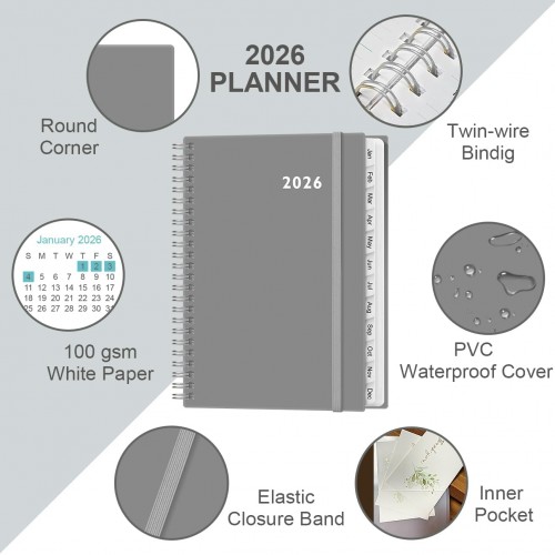 2026 Planner – Weekly and Monthly Calendar Planner from Jan 2026 – Dec 2026, Planner 2026 Spiral Bound with 12 Monthly Tabs, Inner Pocket, Perfect for School Office Supplies, 6.4″ x 8.5″, Grey-C