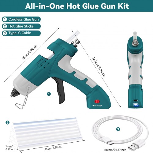- Cordless Hot Glue Gun Kit:This cordless hot glue gun kit include 1 cordless hot glue gun,30pcs glue sticks(7*150MM),1 Type-C charging cable,1 manual.Say goodbye to the limitations of cords and enjoy unrestricted movement during your projects