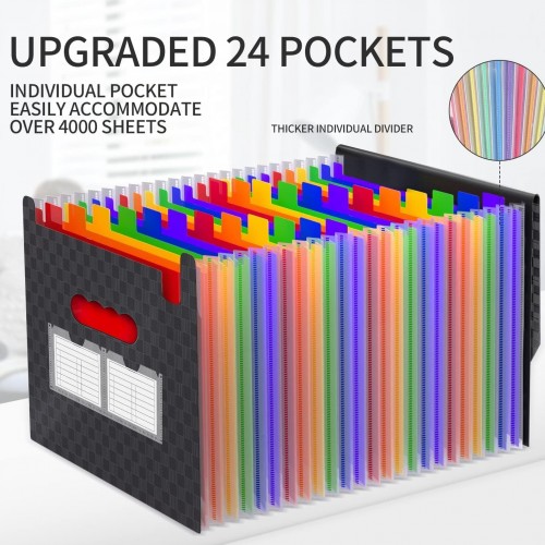 - 【EXPANDING & LARGE CAPACITY】Expandable 24 colorful individual pocket accordian file folders letter size is perfect file organizer for you organizing all kinds of important documents. It can be expanded from 1.18inches to 27inches. Each rainbow individual pocket of desk organizer can be expanded to 1.3inches. Accommodate approximately over 3000 sheets at one time.