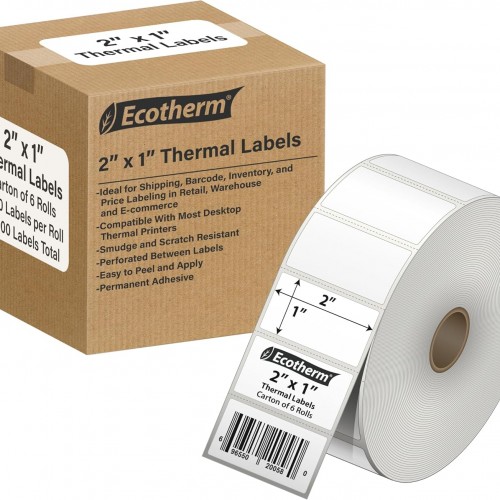 3″ x 1″ Thermal Labels | 6 Rolls | 15000 Labels | fits Zebra, Munbyn, Rollo, Godex, Arkscan, iDPRT, Offnova Thermal Label Printers and More | Blank White Adhesive Stickers by Ecotherm