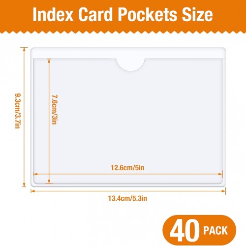 - Adhesive Clear Pockets for Labels Packaging: The outer size of clear adhesive card pockets is 3.7 x 5.3 inch, specifically designed to accommodate 3×5 inch cards or smaller cards.You will recieve 40 pack clear adhesive pockets for labels, these clear adhesive index card pockets with top open are easy to insert or remove the cards or labels.