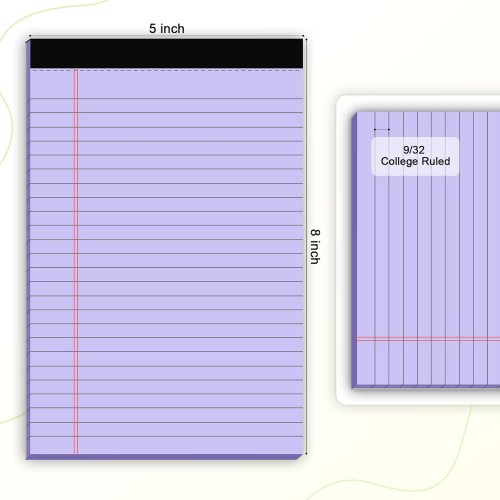 - Purple colored Legal Pads 5 x 8 Inch are perfect for students, teachers, and professionals. Made with premium 80gsm thick paper, these notepads provide a luxurious writing experience. The colored paper resists ink bleeding, while the black lines and double red margin lines offer ample space for your notes.