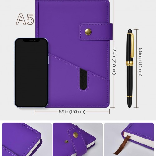 - 【GUSSETED DESIGN】:Gusseted pocket design and cardboard bound cover, metal buckle helps keep notebook securely closed, making it easy to write in the notebook from just about anywhere. This notebook provide you a high quality writing experience. expandable gusseted pocket for stashing loose notes,business cards, receipts, mobile phone, or other small items.