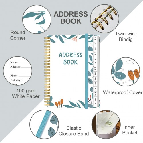Address Book with Alphabetical Tabs – Small Address Book Spiral with Address Contacts, Special Date, Phone, Birthday & Internet Login Password for Home and Office, 4.3″ x 6.2″, Teal Leaf