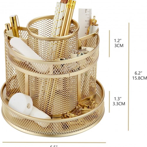 Annova Mesh Desk Organizer Rotate with 5 Compartments Round Spinning Tidy Candy/Pen Holder Desk Accessories Office, Art Supply, Storage, Classroom, Home (Gold)