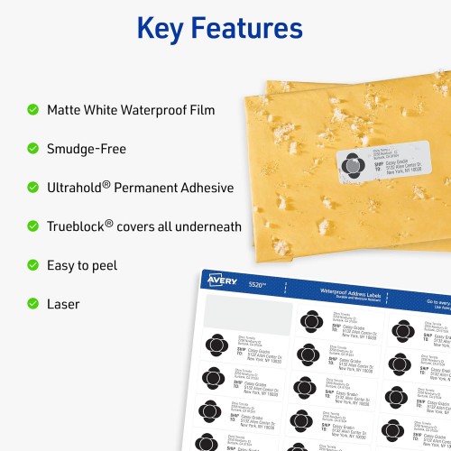 - Waterproof Durability: These Avery sticker labels remain intact even when submerged in water, and are suitable for use on smooth surfaces like cardboard, paper, plastic, glass, and more