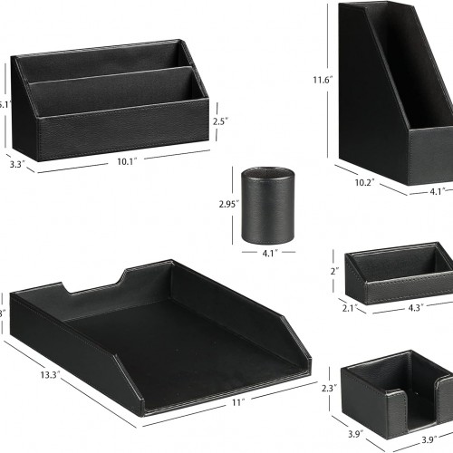 - / DESK ACCESSORIES SET OF 6 PIECES : Include 1*Magazine& Files Holder 1* Mails& Letter Sorter 1*Pens/Pencils Holder Cup 1*Sticky Note Container 1* Letter Paper Tray 1*Business Card Holder. Storing all office supplies in organized, accent your workspace and study room with this desk organizer set.