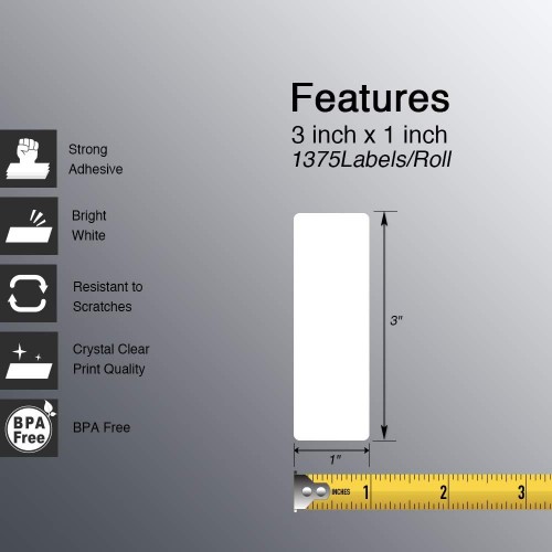 - [ Specifications ]: 3 in x 1 in (76 mm x 25 mm) (1375 Labels/Roll, 10 Rolls),Paper tube diameter:1″(25.4mm). No Ink Toner or Ribbons Needed! Save your money and effort.