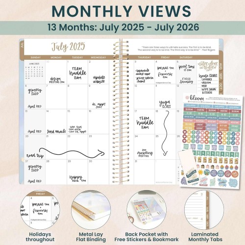 - LAYOUT: 2 page monthly overview spreads and spacious weekly views run academic year, JULY 2025 through JULY 2026 — 365+ days!