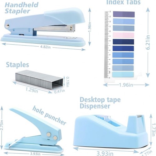 - Package Includes – This blue office supplies contains 1x Stapler, 1x Magnetic Staple Remover, 1000x Staples, 1x Tape Dispenser, 1x Single Hole Punch,4x Bulldog Clips 4x Small Clips 2x Hollow clip 2x Big Clips 70x Paper Clips and 10 colors Tabs with ruler. Beautiful and lovely blue desk accessories combination can meet your daily office and study needs.