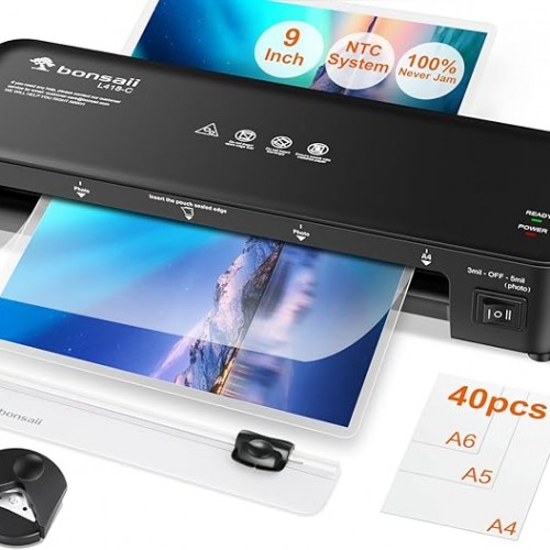 - 【Versatile & Compact Design】The Bonsaii 9-inch laminator comes with 5 laminating pouches for instant use. Its compact design (12.65″L x 3.74″W) ensures easy storage and portability, making it ideal for home, classroom, or office lamination tasks.