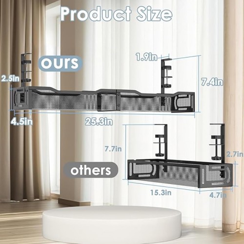 - 【Under Desk Cable Management Tray】Our workspace organizers are suitable for the desk within 0.4″ to 2″ thick. The cord organizer built-in non-slip rubber pads on the clamp to protect the desk surface from scratches. The desk accessories supports both inward and outward installation, you can easily change its position as needed.