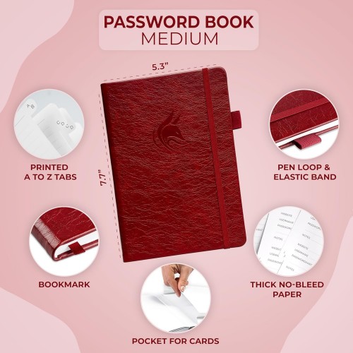 - MEDIUM SIZE & PREMIUM QUALITY – This internet address and password logbook with tabs comes in medium size (5.3×7.7 inches). The password notebook has an eco-leahter hardcover, elastic band, pen loop, bookmark, pocket for notes, and thick 120gsm paper.