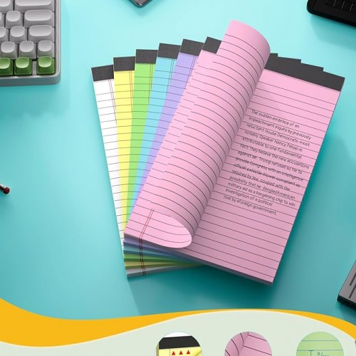 - [Multicolor Legal Pad Set]: This set of legal pads 5×8 includes sheets in six vibrant colors—yellow, white, blue, green, pink, and purple—making it perfect for color-coding notes, meeting minutes, schedules, or project outlines. Small note pads 5×8 high-contrast paper tones help prevent visual overlap, allowing you to easily categorize and distinguish information across different tasks or departments.