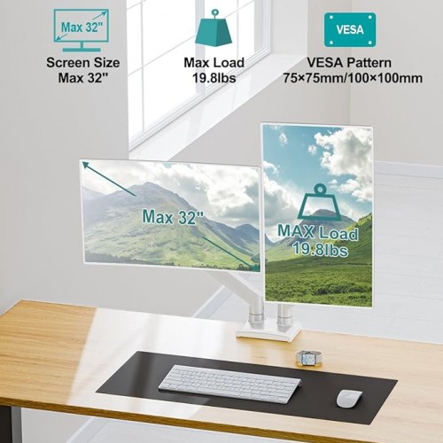 Dual Monitor Desk Mount – Adjustable Monitor Arm for 2 Monitors up to 32 inches/19.8 lbs, Double Monitor Stand VESA Bracket with C-Clamp & Grommet Mounting, Computer Screen Mount, White, Freelift