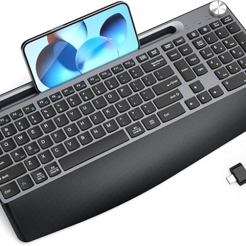 - 【Full-Size Keyboard With Phone Holder】The full-size wireless keyboard is designed with a phone and tablet holder. Provides you with additional space to place your phone, tablet, or other gadgets,never miss anything important messages again.You can work by using a laptop when placing a phone or tablet, or watching videos while working.(Note: Keyboard only hold the devices,not work with them.)