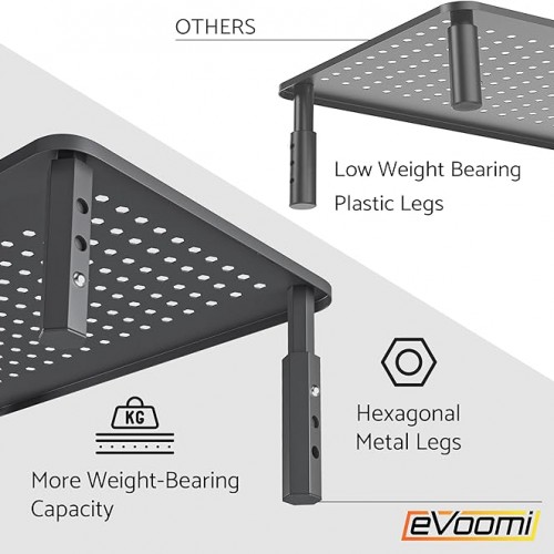 - This Dual Monitor Stand is a Back Saver – Posture, Performance & Circulation: Tense neck? Evoomi’s Ergonomically Optimized Eye Level height promotes proper posture and optimal circulation.