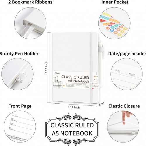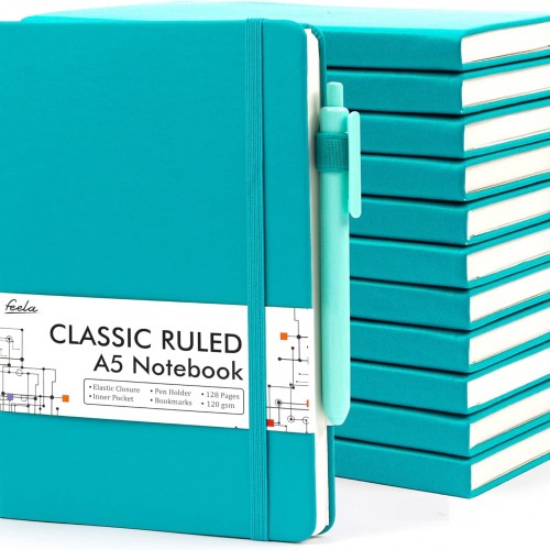 feela 12 Pack Notebooks Journals Bulk, Hardcover Notebook Classic Ruled Lined Journals with Pen Holder for Women Girls School Business Supplies, with 12 Black Pens, 120 GSM, 5.1”x8.3”, A5, White