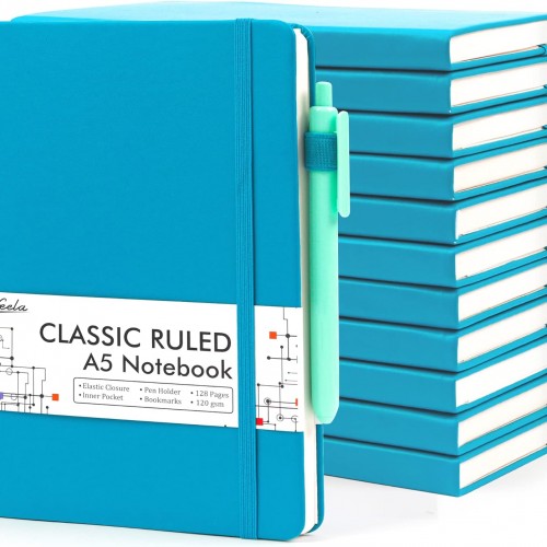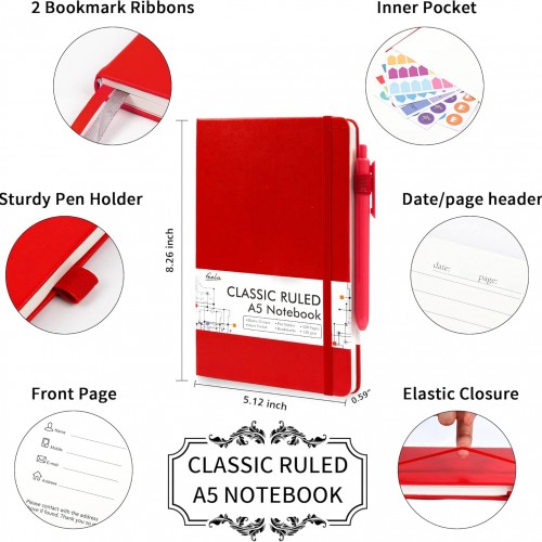 feela 12 Pack Notebooks Journals Bulk with 12 Black Pens, A5 Hardcover Notebook Classic Ruled Journal Set with Pen Holder for School Business Work Travel Writing, 120 GSM, 5.1”x8.3”, Red